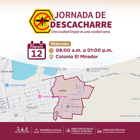 Guaymas, Sonora, 10 de febrero de 2025.- A trabajar de manera conjunta en la Jornada de Descacharre para prevenir el dengue, zika y chikungunya, invita el Ayuntamiento de Guaymas a familias de las colonias Mirador, Rastro y Aranjuez, indicó la directora de Salud Pública Municipal.